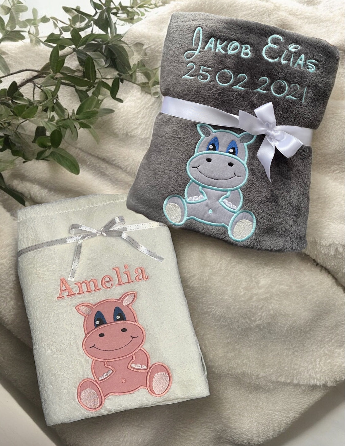 Babydecke kleines Nilpferd Hippolino personalisierbar mit Namen, Datum, Gewicht, Uhrzeit und Größe